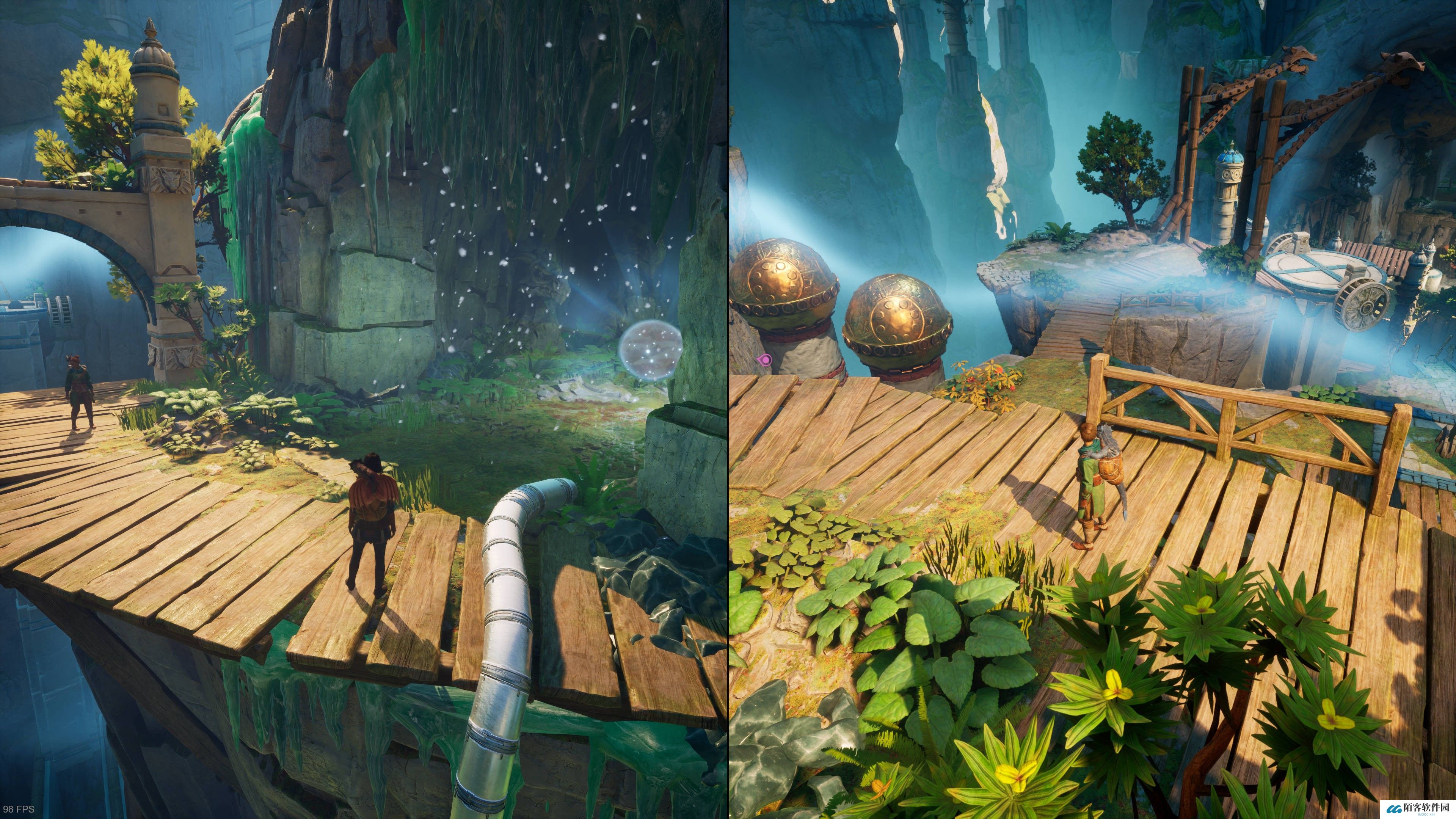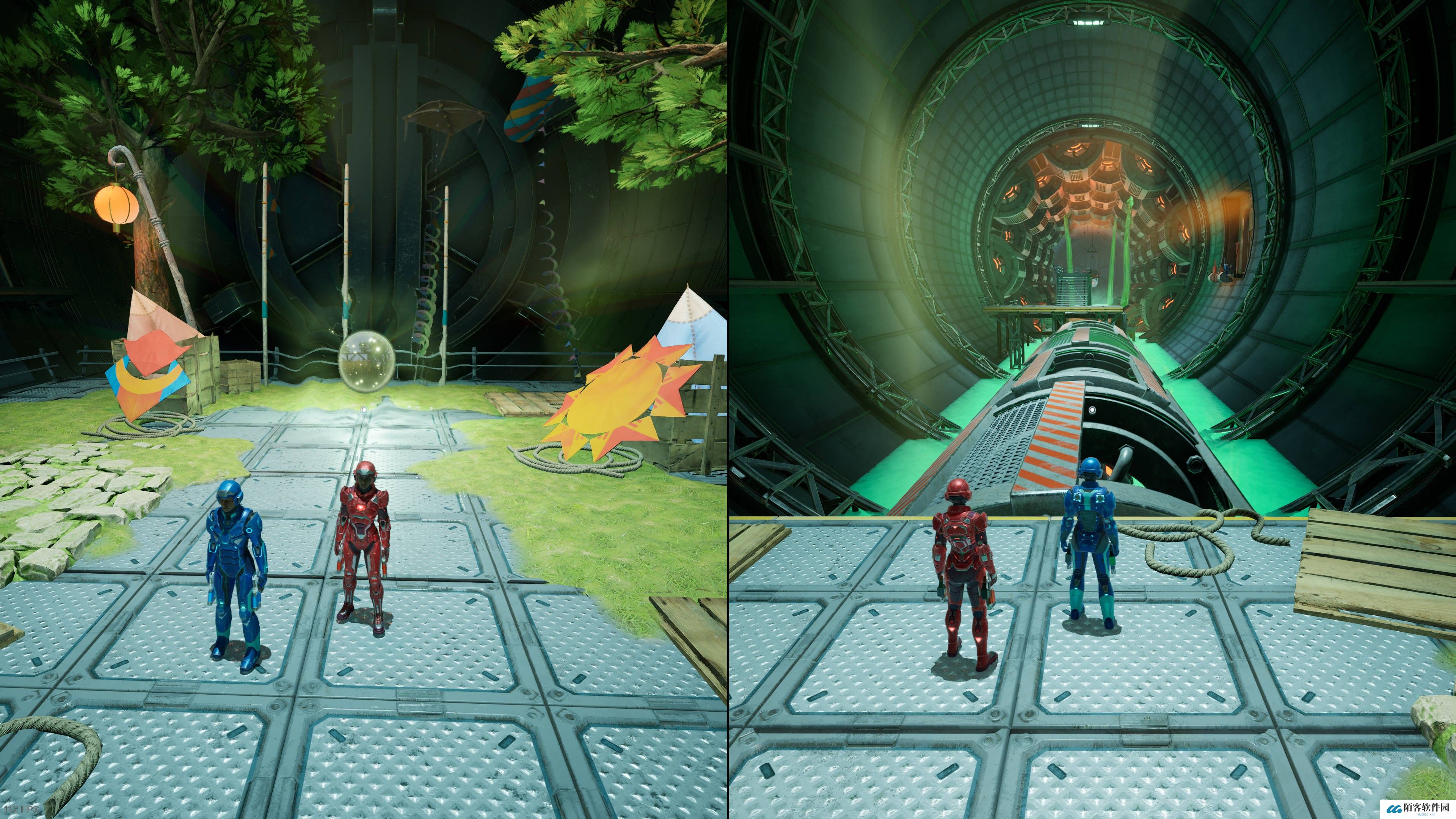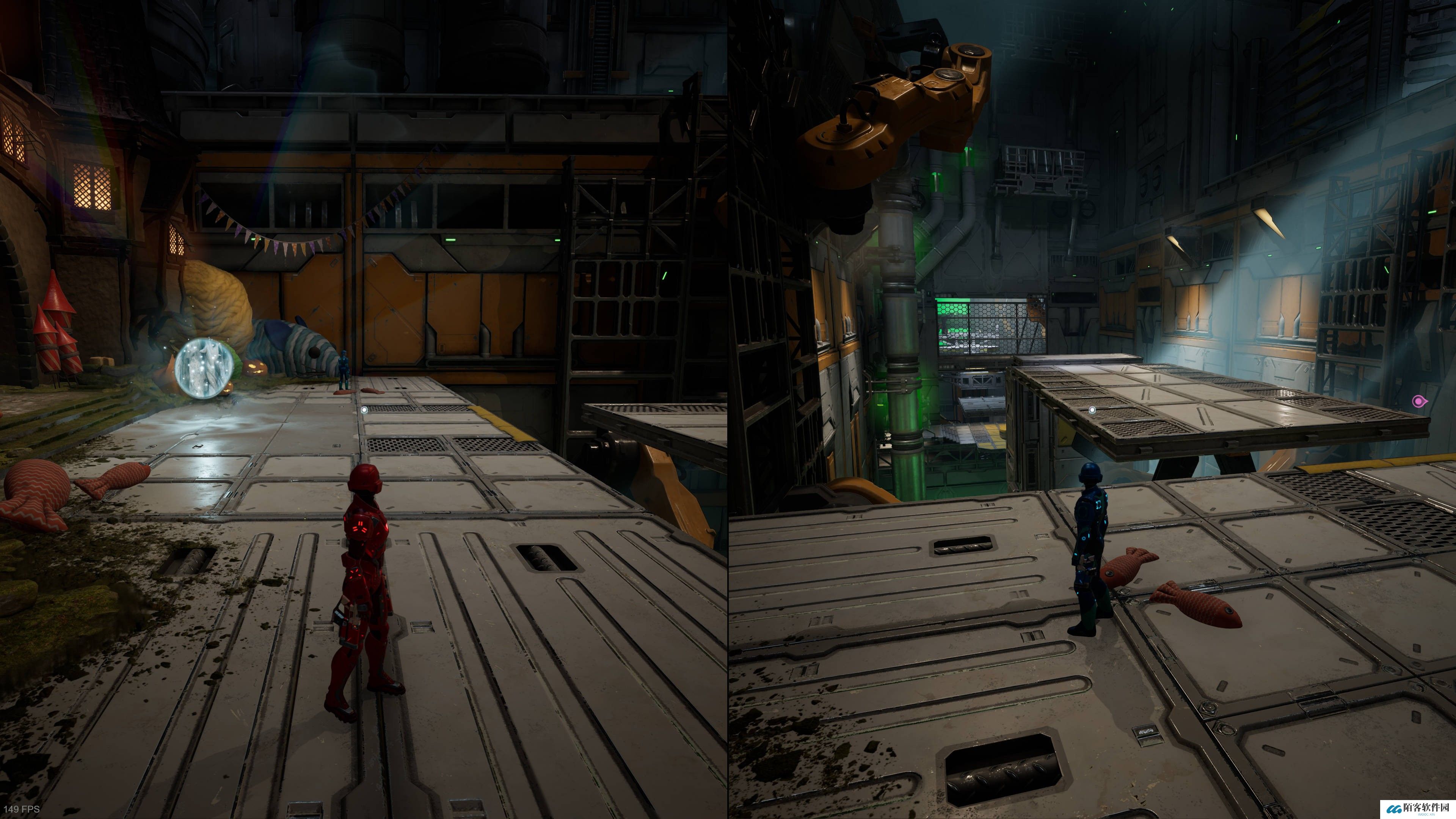 走过机械手移动的平台后,直走有一道需要两位玩家合力解锁的门。开门后跳上四个移动平台,再合力移开挡路的机械手就是支线入口。
