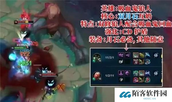 1.月石再生器与相互加血 吸血鬼与狼人的组合可以通过月石再生器互相加血,这使得它们的生存能力极为强大。核心强化选择减技能CD和护盾效果,可以提高它们的耐久性。