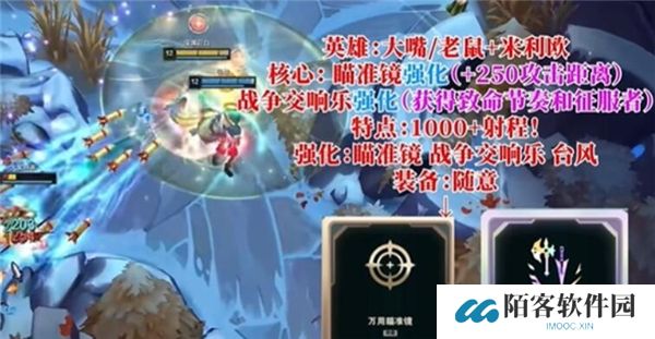 1.万用瞄准镜与战争交响乐 明烛与大嘴/老鼠的组合通过万用瞄准镜极大提高射程,战争交响乐的加成使得射程进一步增加。大嘴或老鼠能够在远距离对敌人造成致命打击。