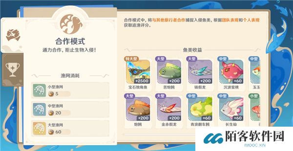 玩法为四人合作共同捕捞鱼类,最终得分计算包括团队分数和个人分数。这个模式偏向娱乐,大家可以随意体验。