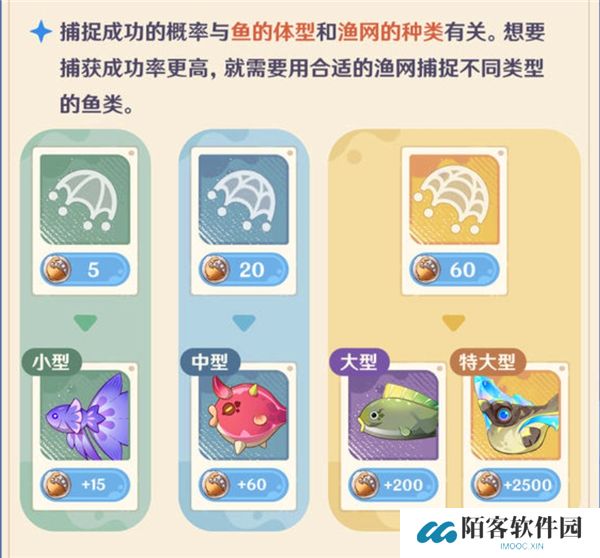 在捕捞鱼类时,根据鱼的体型选择合适的渔网。合理切换渔网可以提升捕获的概率,避免行动点浪费。