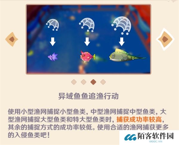 本次活动与经典的捕鱼游戏相似,玩家需要消耗行动点来投掷渔网,捕捉入侵的鱼类。为了提高捕获成功率,使用对应渔网捕获匹配体型的鱼会更有优势。