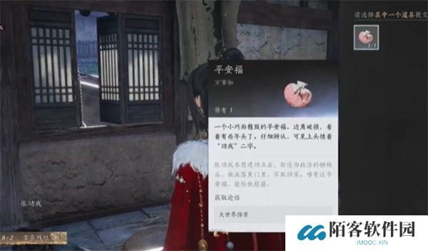 之后,进入房屋,与张功成对话,得知他遗失了平安符。