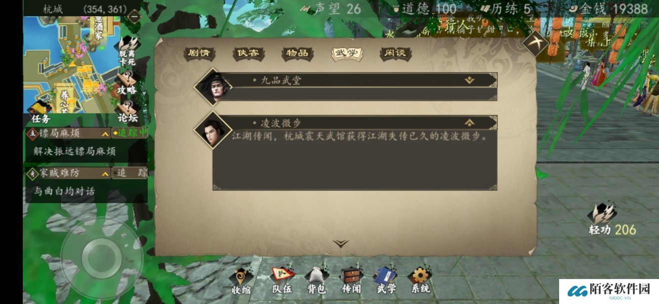 2、震天武馆里有只有橙色孤鸿入海轻功和最高蓝色秘籍;