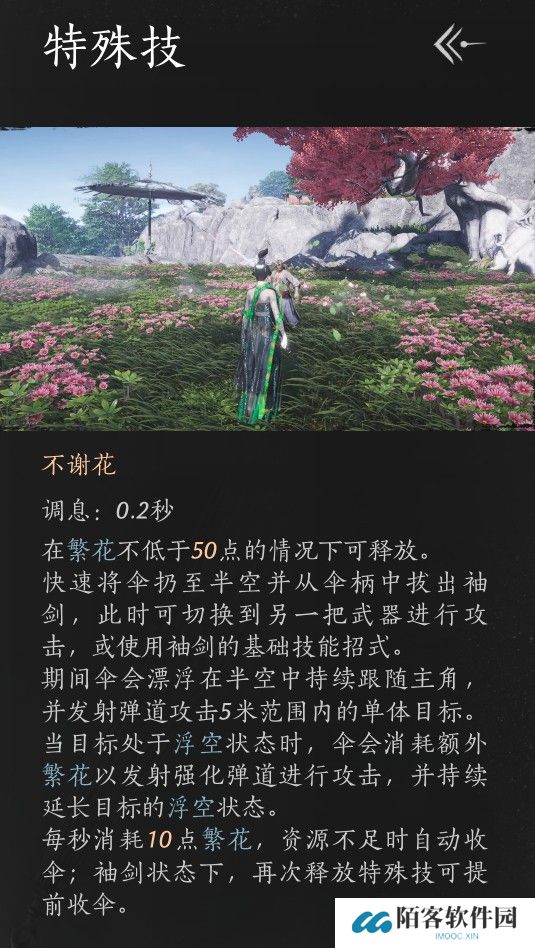 然后拉开一点九伞武学技抛春恨触发花上月令的增伤效果,随后直接起飞轻击蓄力打光所有耐力。落地接抛春恨,接九伞特殊技不谢花,让伞自动继续输出。