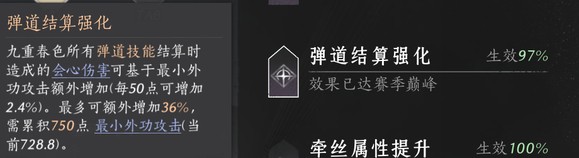 3、词条取舍:重中之重。词条是决定差距的根本。最核心的就2个词条,看到无脑堆:会心率,最小外功攻击。前者不用我多说,会心治疗,会心输出都指望它。后者是因为九伞之所以输出领先版本的根源就在于它的天赋加成如图。