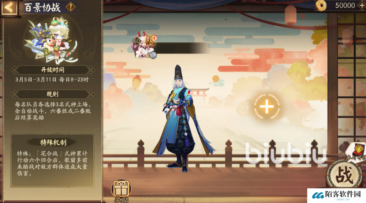 活动期间每天早上8点到晚上23点,玩家可以参加“百景协战”来进行特别版本的“协同对弈”,在选择式神的过程会出现特殊“花合战”式神,这些式神可以在战斗中触发特殊的祝福效果,根据拥有的奖励次数可以获得随机6星御魂,大蛇逆鳞,被遗忘的绘本等。