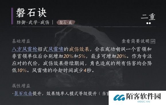 以八方枪的武学技风雷啸为例,带上磐石诀应该为20%减伤+磐石诀20%减伤(4重25%减伤)。请注意,风雷啸的20%嘲讽“使Boss降低20%伤害”应该是乘法而非加法,为避免干扰,不考虑该词条的减伤效果,后续相同