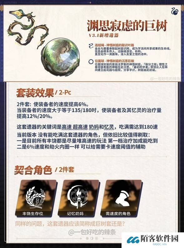 以上就是就是笔者所总计崩坏星穹铁道3.1新遗器的具体攻略,不论是谧宁拾骨地还是渊思寂虑的巨树的效果和适配角色都详细为大家所说明了,让玩家能够轻松了解到该给什么角色刷。