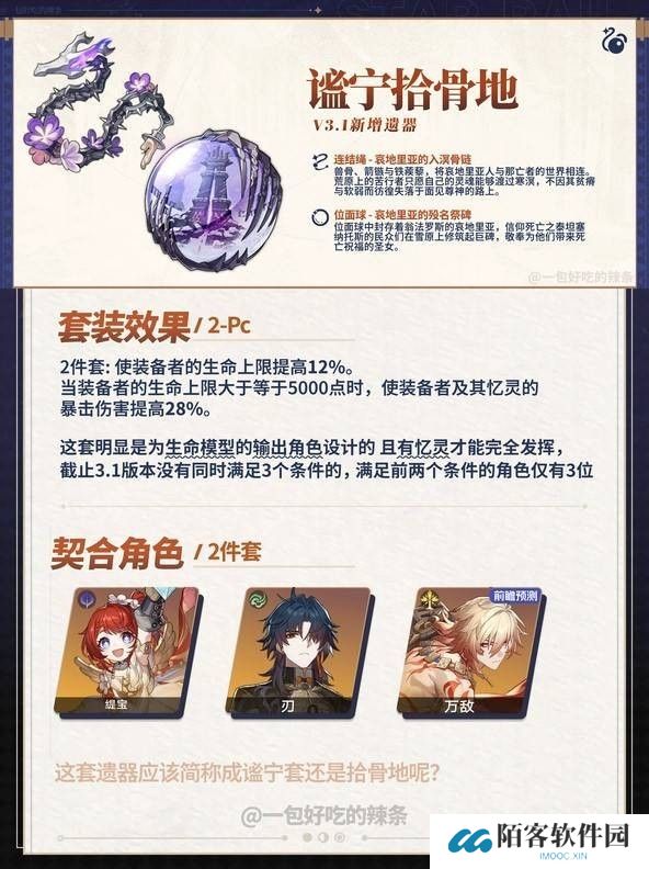 这套遗器的核心是生命值+暴击伤害加成,适合那些依赖生命值作为输出来源的角色,同时拥有忆灵的角色也能获得额外增益。