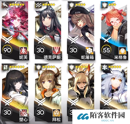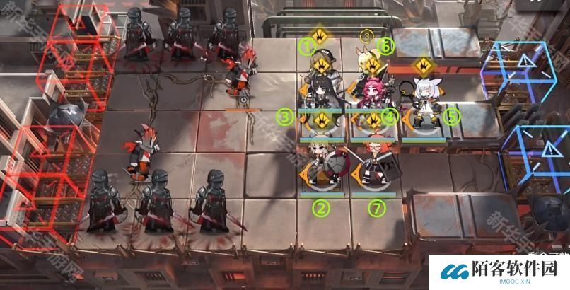 如图所示,开场依次部署蛇屠箱(朝左)、拜松(朝左)、塑心(朝左)、妮芙(朝左)、白面鸮(朝左)、临光、米格鲁(朝左)