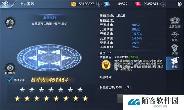 圣器不仅能提供单体增益,还可以依托法阵系统进一步增强角色能力。锻星系统允许玩家通过消耗特定资源提升圣器法阵的星级,以此获得额外的属性加成,并解锁特殊的法阵光环技能。