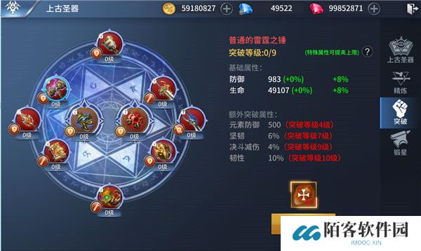 突破是进一步提升圣器潜力的玩法,玩家需要消耗一定数量的突破石或其他指定材料,让圣器突破等级上限,获得额外属性加成和特殊技能强化。