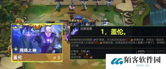 盖伦的技能介绍如下图,获得护盾,还有范围伤害,还有回蓝效果