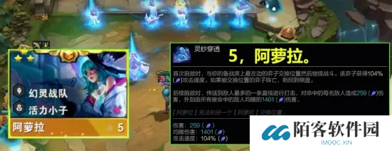 技能能和和备战区最左边的棋子交换位置,让其上场作战,给予攻速加成,棋子阵亡之后,阿萝拉再次上场,造成多断AOE伤害