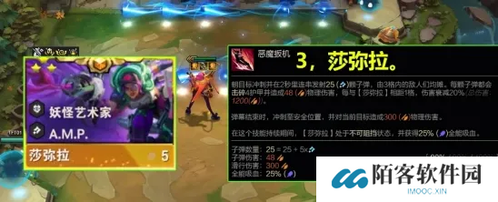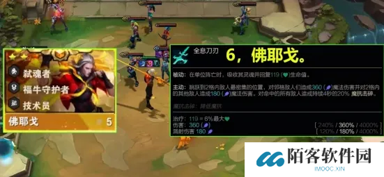 被动是攻击附带额外魔法伤害,血量掉到35%的时候,获得护盾,还有超高加成。主动技能减伤,然后能挑飞战场上的对手棋子,再一起摔落,伤害爆炸